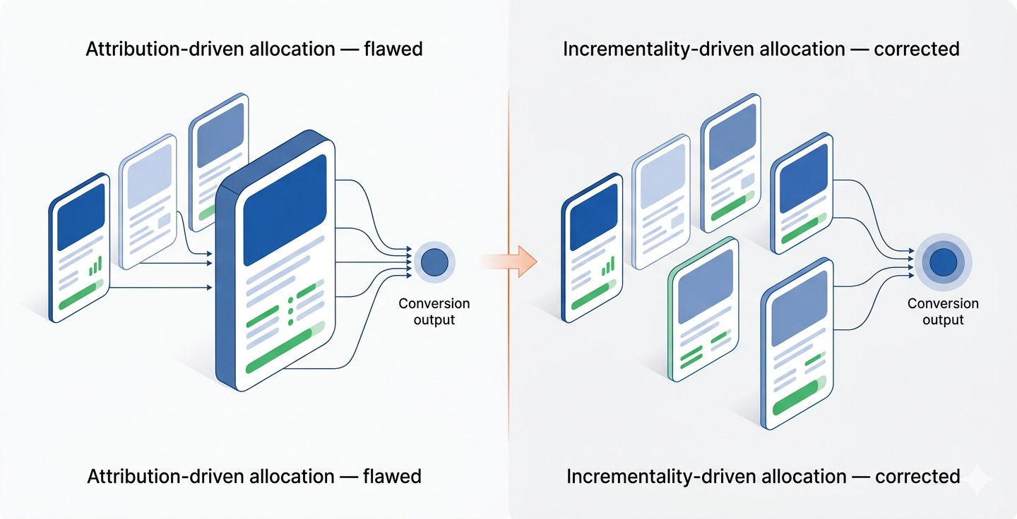 This reallocation typically produces a portfolio with lower overall attributed ROAS and higher actual revenue impact. The attributed ROAS declines because budget is moving away from campaigns that were efficiently claiming credit for high-intent conversions. The actual revenue impact increases because budget is moving toward campaigns that are genuinely causing new conversions that would not have occurred organically.