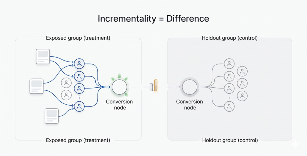 Incrementality testing compares outcomes between an exposed group and a holdout group with no exposure. It answers the question: does the advertising produce conversions that would not have occurred organically? It does not assume the campaign is producing value. It tests whether that assumption is correct.